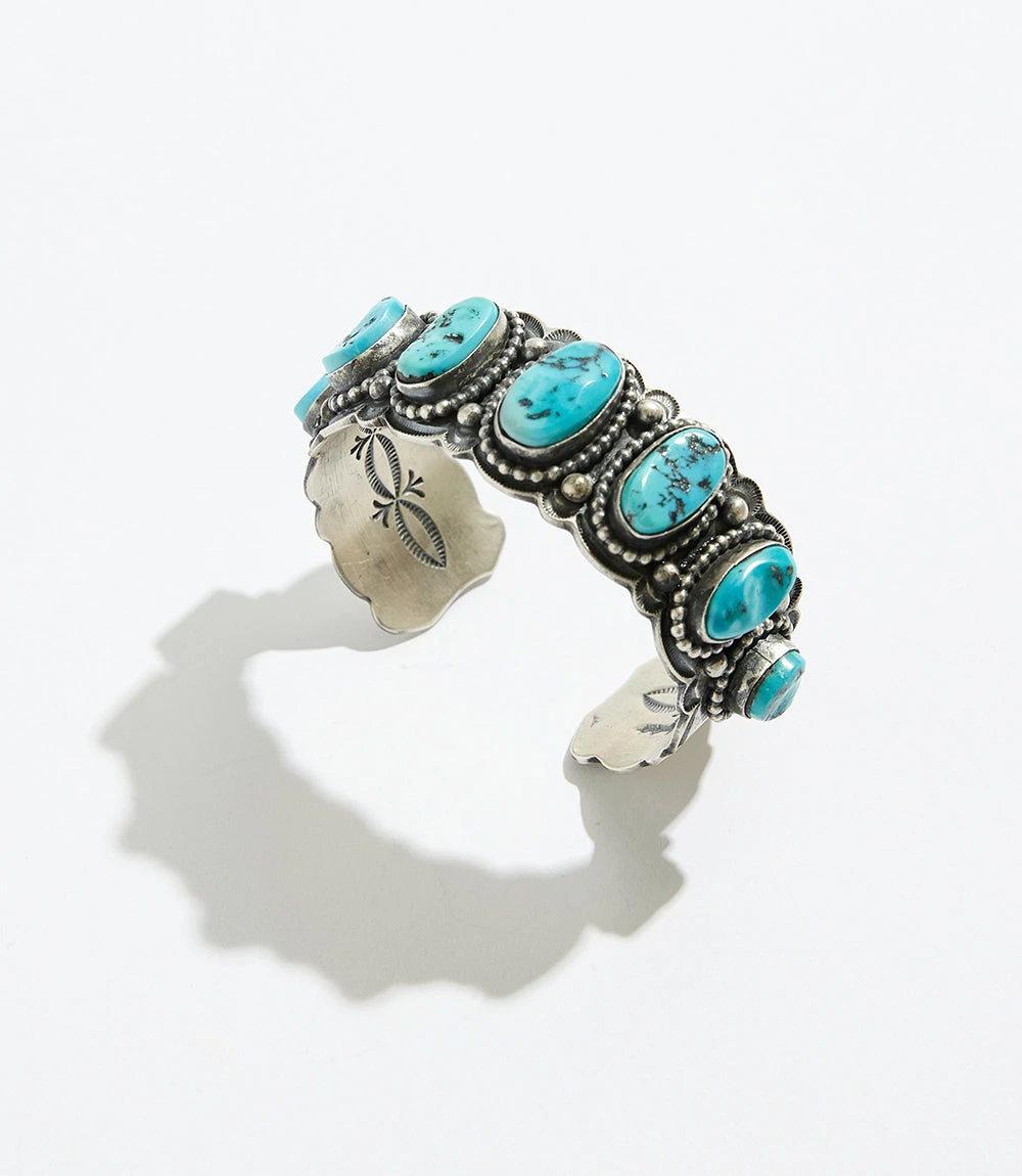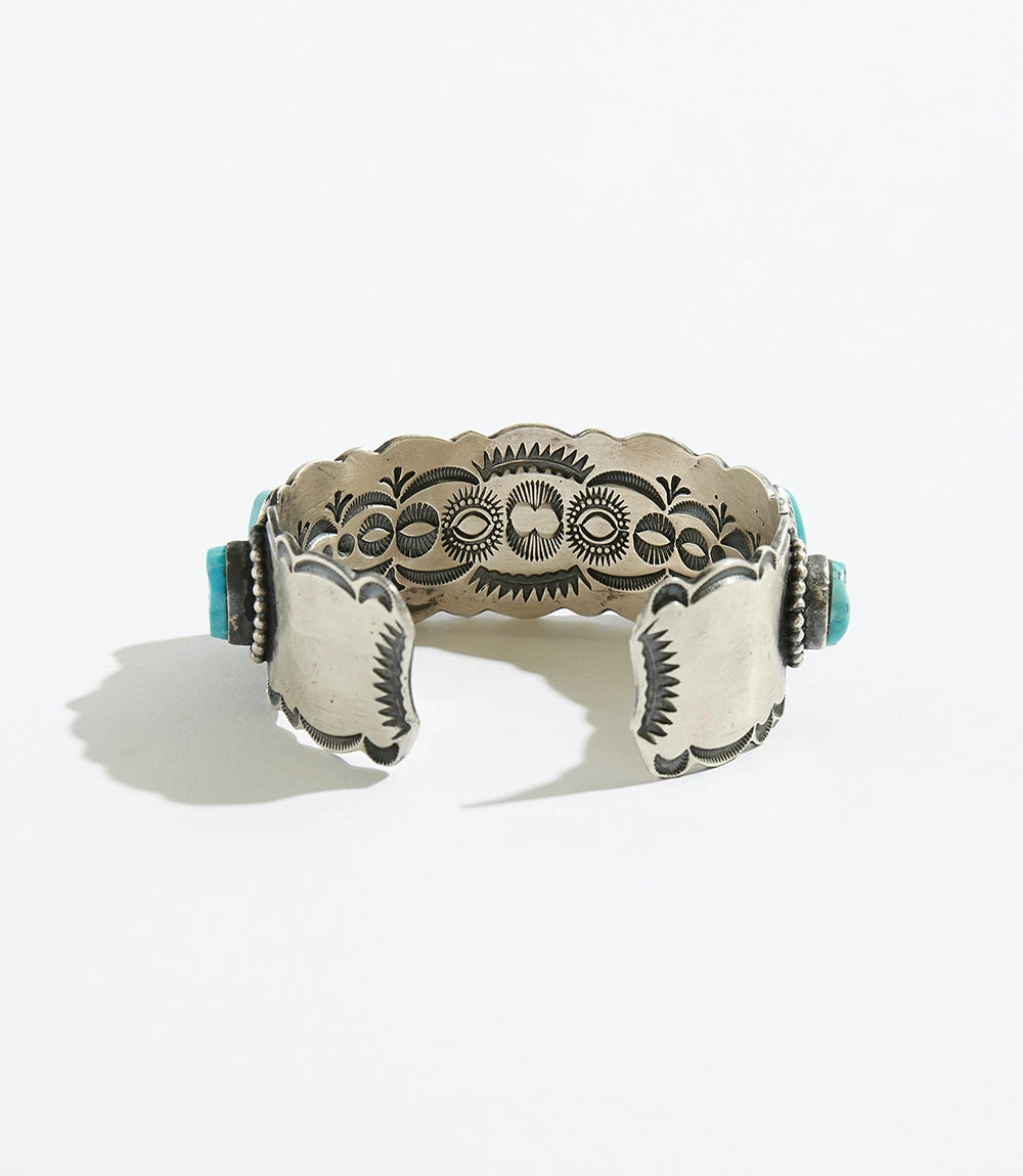 One-of-a-kind turquoise stones are encased in a sterling-silver cuff that is detailed with exquisite deep stampwork and silver droplets that decorate the edges.