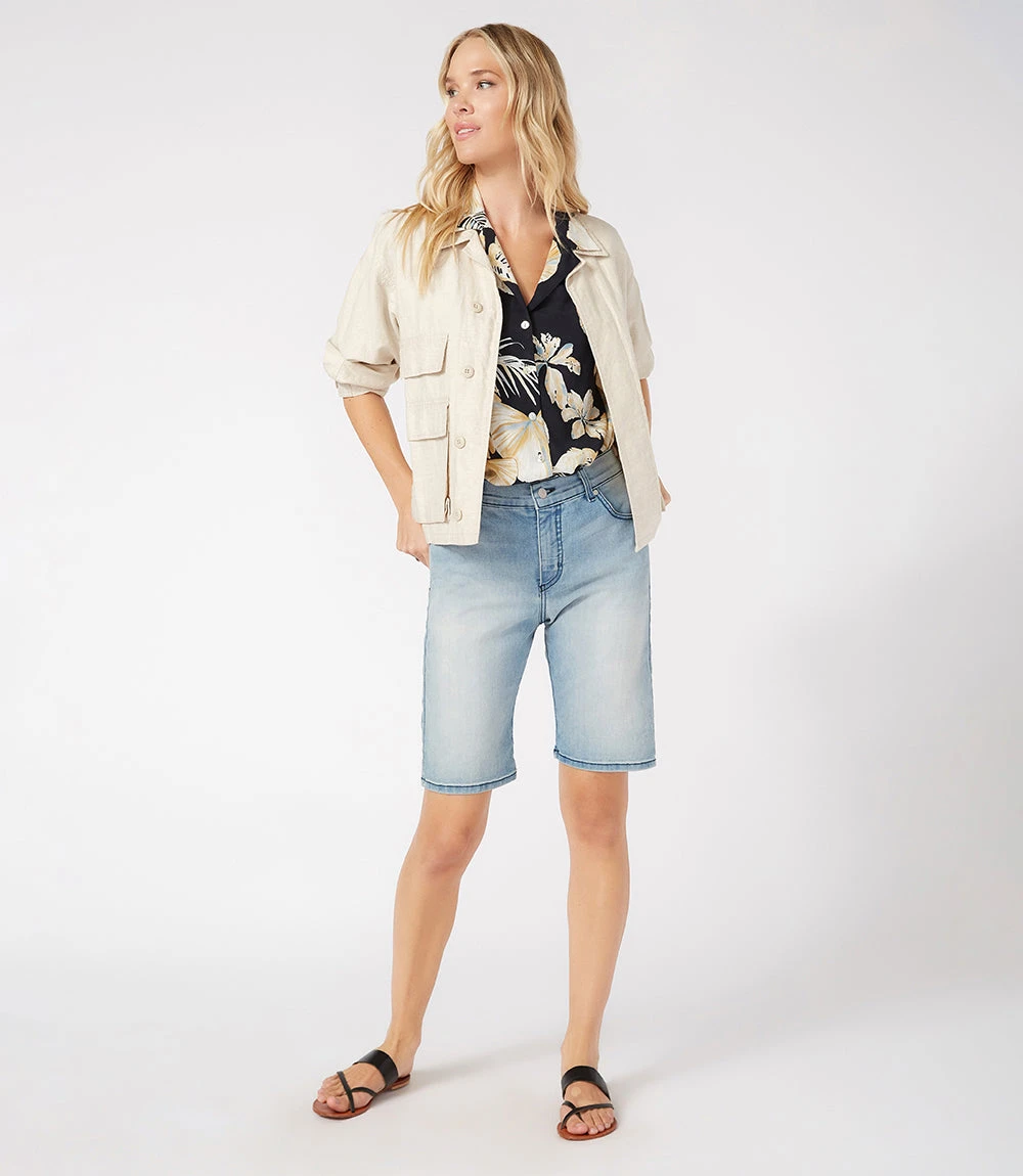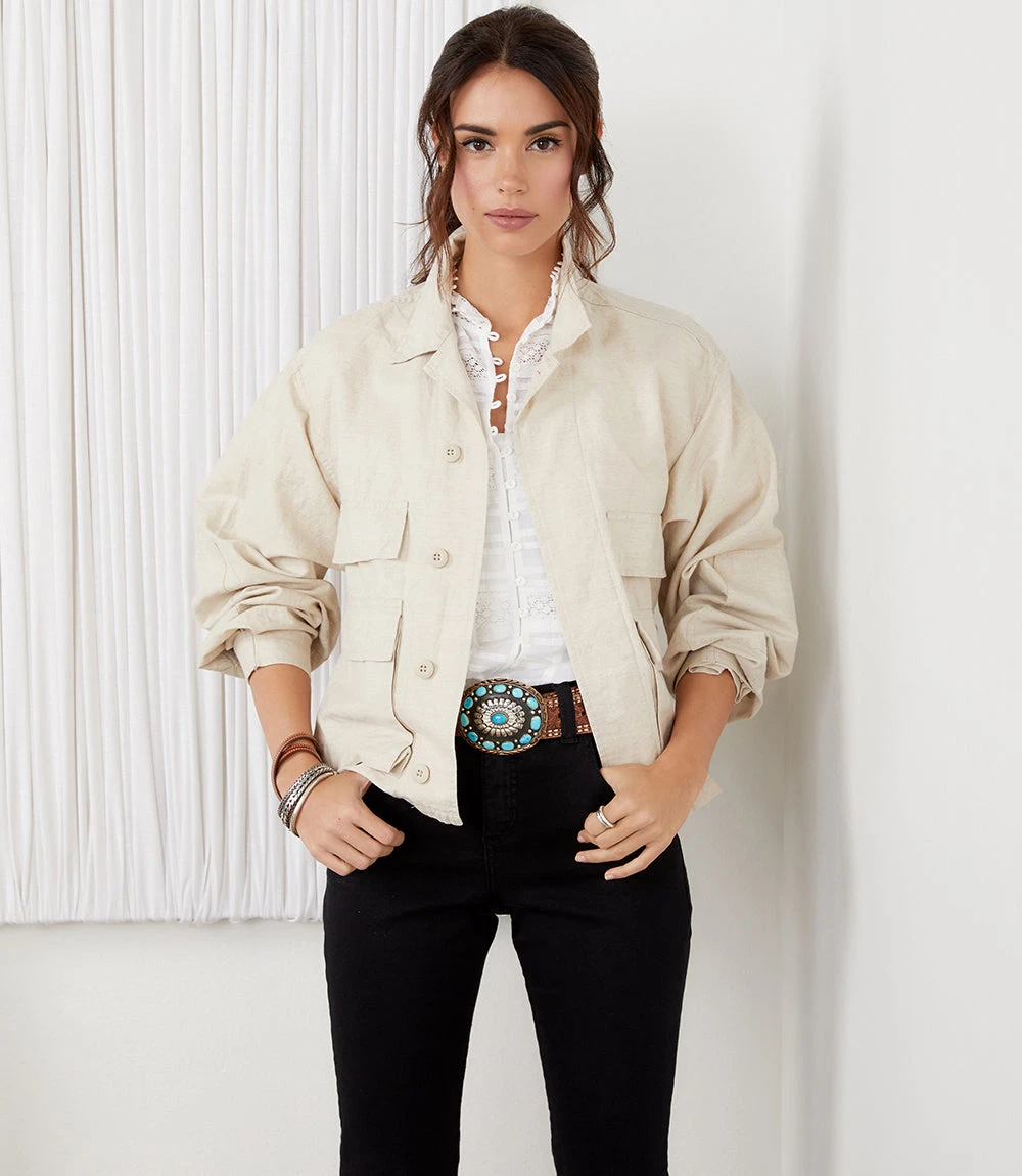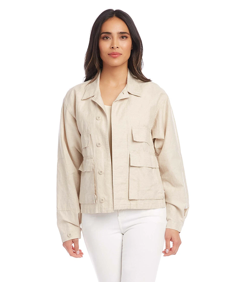 Layer this versatile linen blend cargo jacket over your casual looks for lightweight, stylish coverage. This jacket is also fashioned with flap pockets for plenty of storage space.