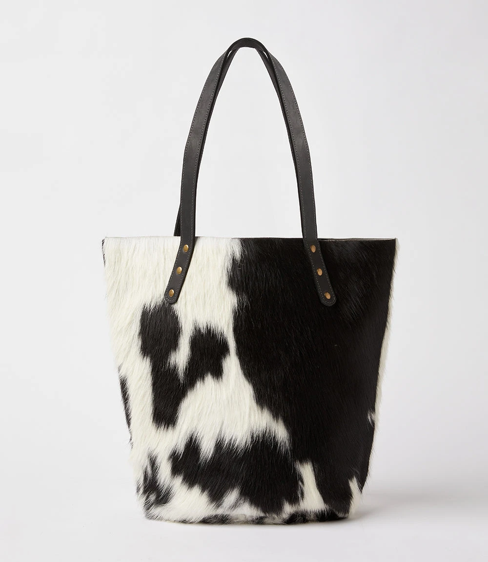 Add a western element to your look with this unique cowhide tote topped with soft leather handles. Hand-crafted by artisans in Kenya. Due to the handmade nature of this item, there will be variations in hides.