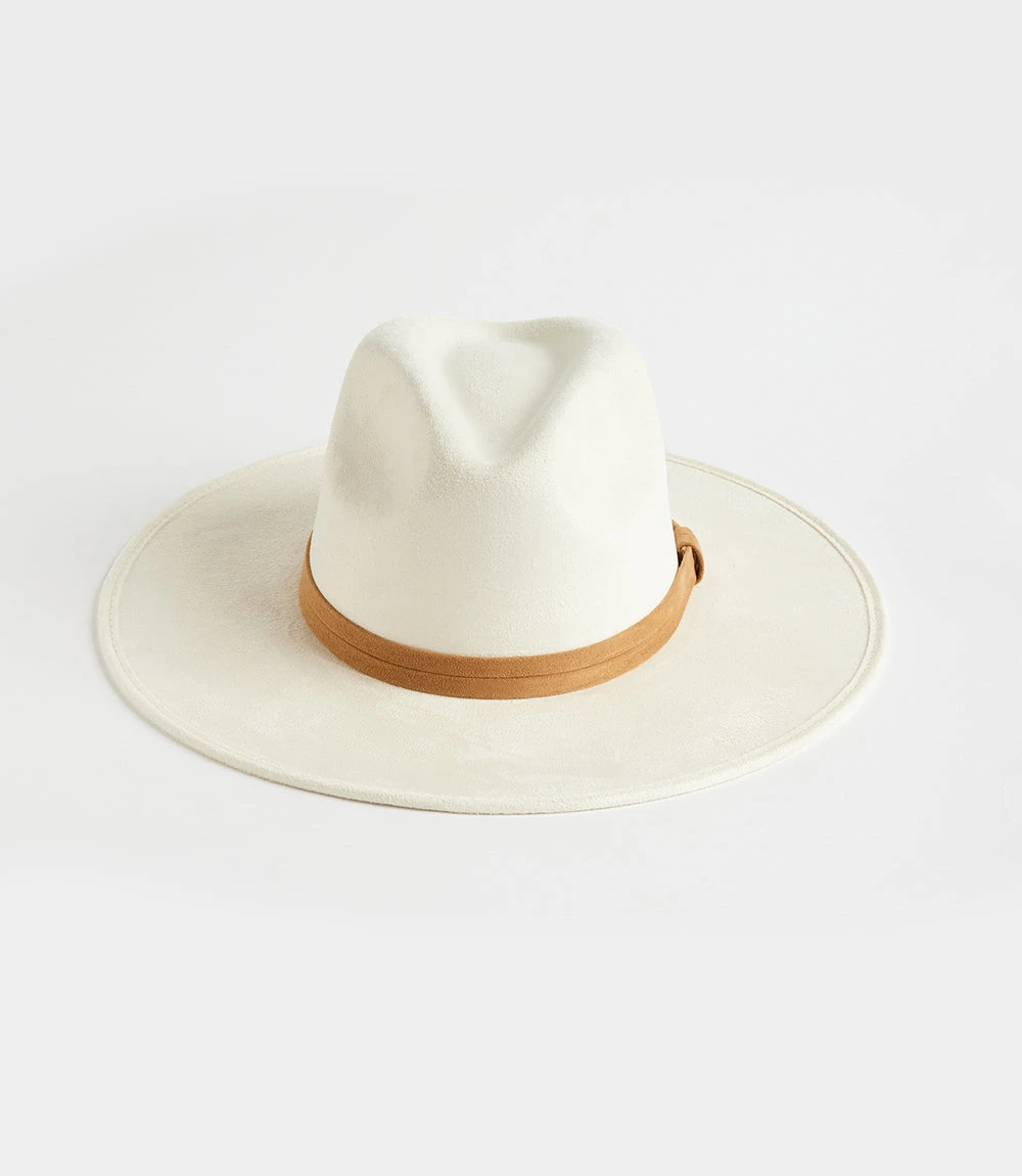 A double-band of faux suede trims the crown of a classic faux suede fedora.
