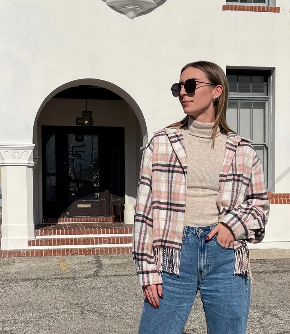 Fluttery fringe details the hem of this brushed plaid jacket in soft pastel tones. Layer this timeless plaid jacket over your casual looks for lightweight, stylish coverage.