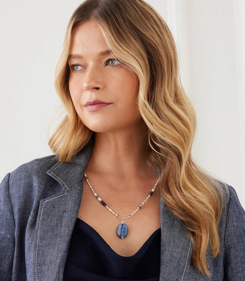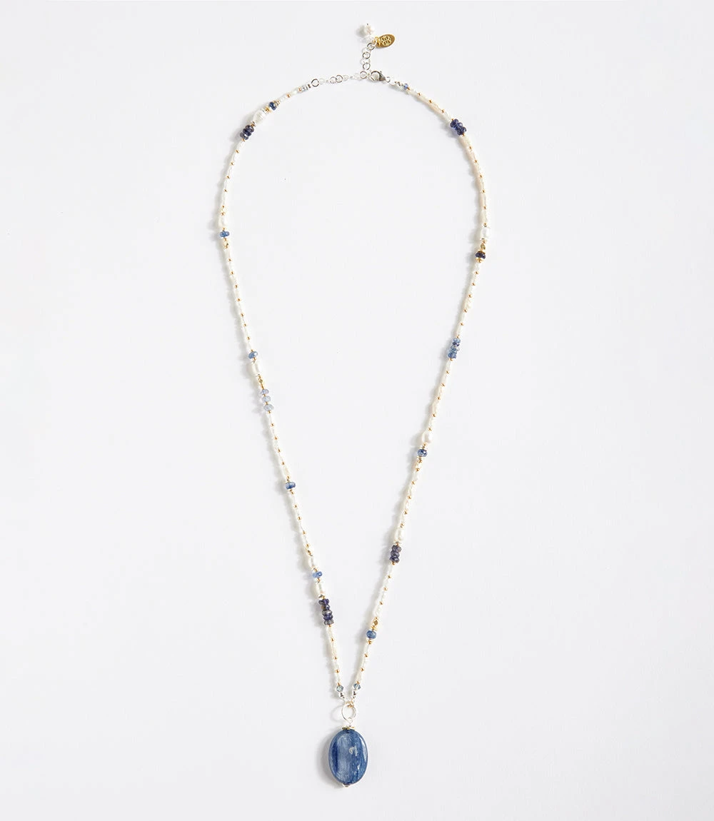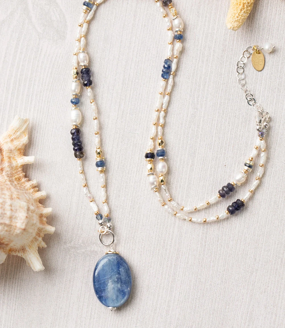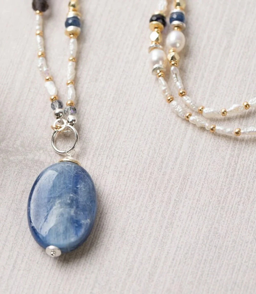 A beautiful array of blues and white stones composed with natural gemstones and fresh water pearls. This necklace’s focal point is a stunning oval kyanite stone that shimmers in the light.