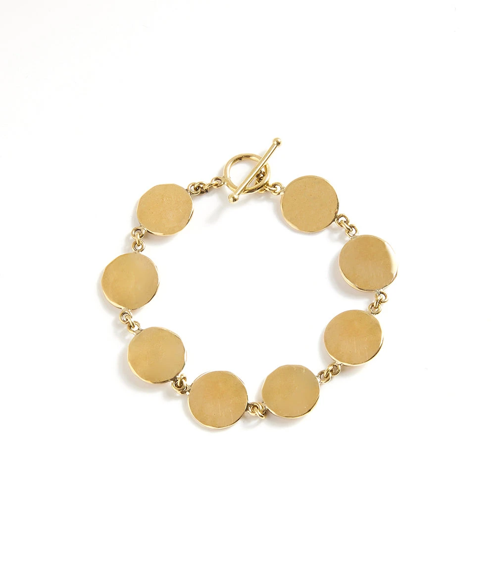 Hand casted solid brass circle charms linked together with a toggle closure. Handmade by skilled artisans in Kenya with raw materials that were up cycled and locally sourced. A portion of every purchase goes directly to support sustainable community development projects in Kenya.