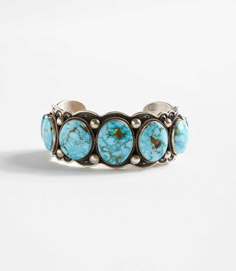 This sterling silver cuff was delicately made by a Navajo artist. Stunning Kingman turquoise stones are encased in this sterling-silver cuff. It’s detailed with exquisite deep stampwork and silver droplets.
