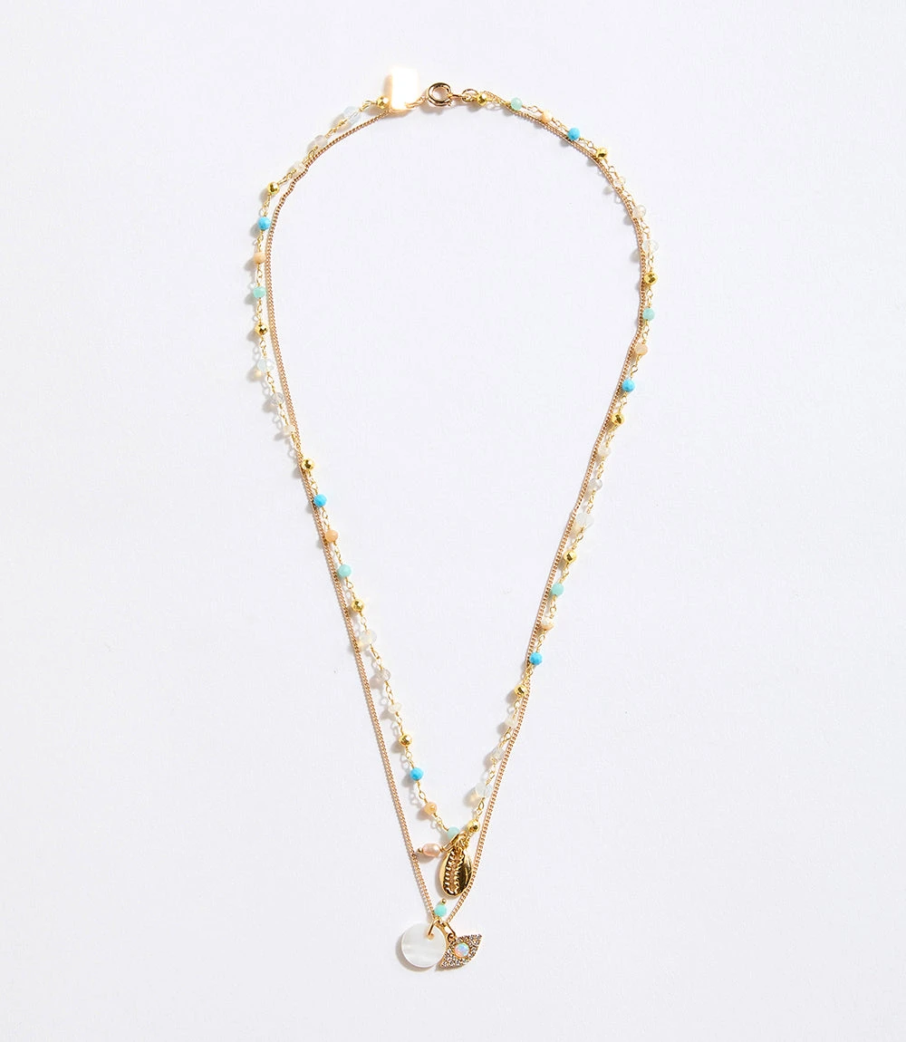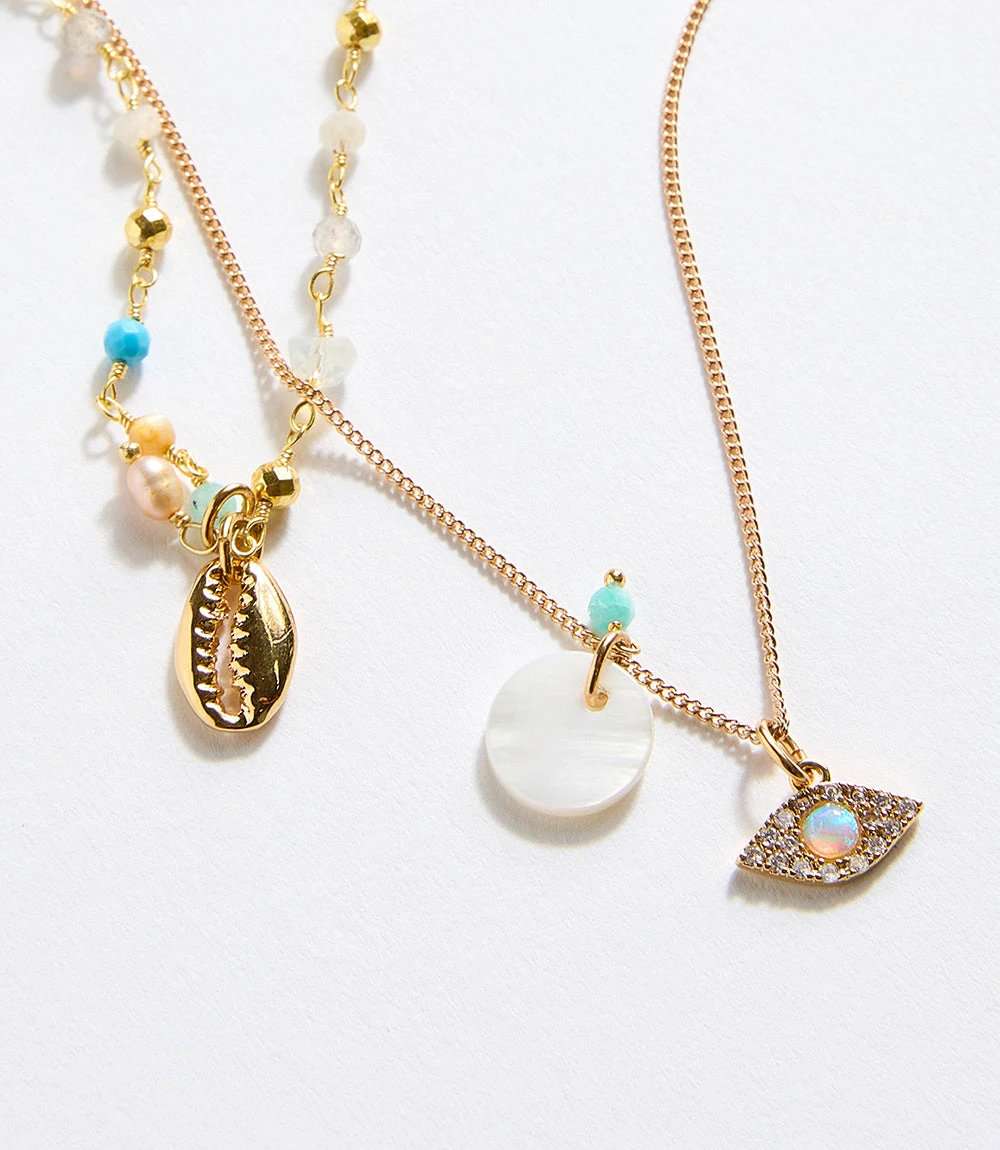 Handmade in France, this Bohemian necklace features tiny charms: a gold-plated cowrie shell, a small mother-of-pearl disc, and a pavé crystal ‘evil eye’, which has been associated with warding off variations of evil intentions. This symbol is very common in many different cultures and religions around the world.