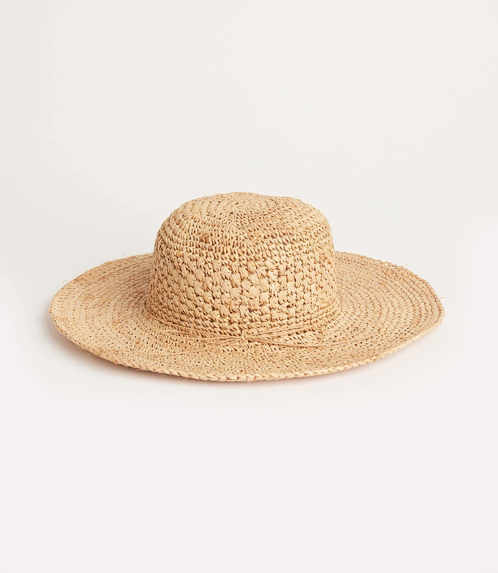 This natural wide brim hat is detailed with a tie around the brim. It’s a perfect choice for easy, stylish protection from the Sun.