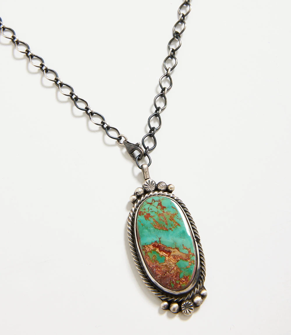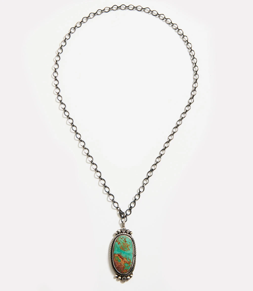 Handcrafted by artisans, this stunning necklace is detailed with a turquoise pendant encased in sterling-silver.