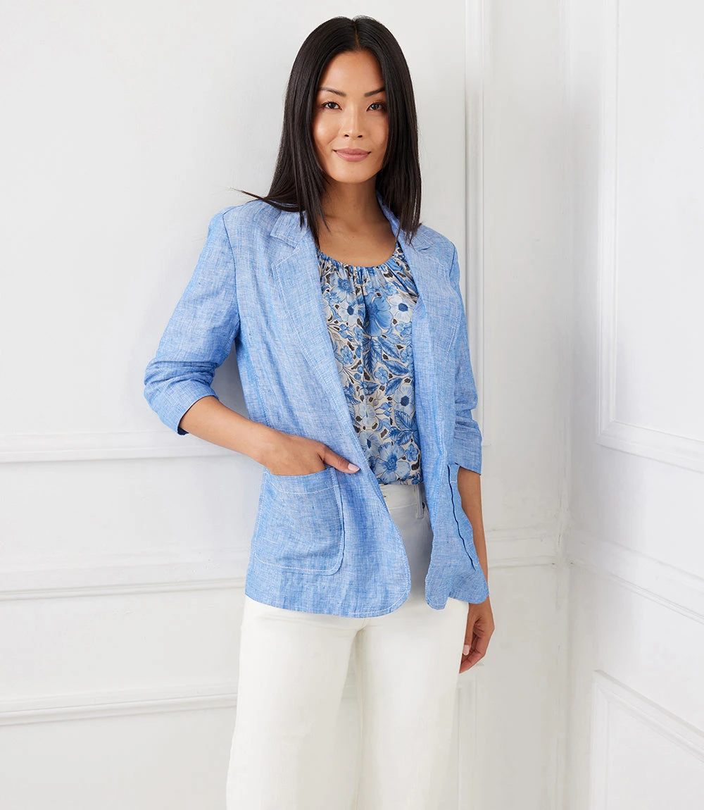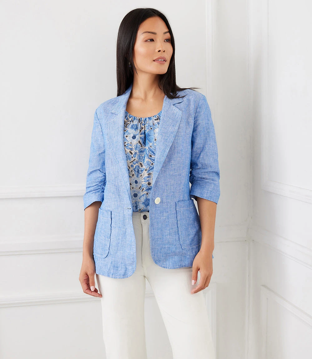 Polished details like a notched collar and ruched sleeves make this lightweight jacket work whether you’re in the city or at the beach. It’s cut from cool and breathable linen.