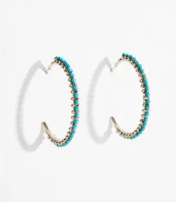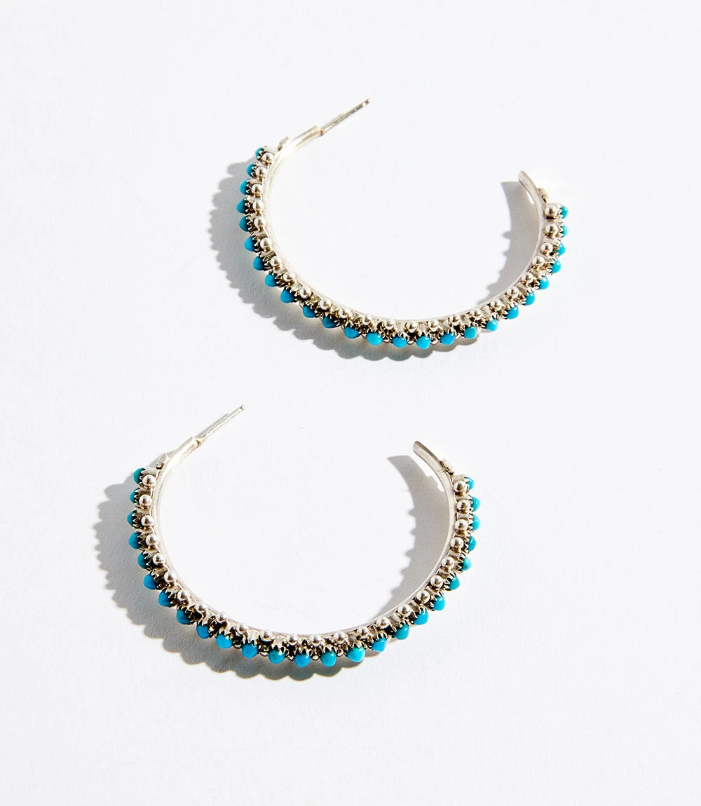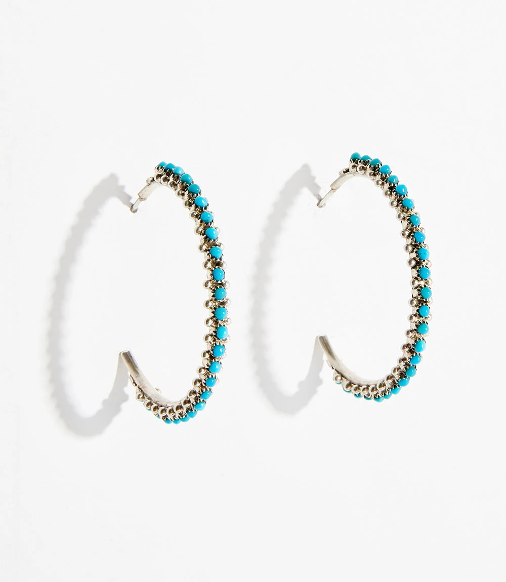 These stunning one-of-a-kind earrings are composed of miniature turquoise stones, individually hand-carved and set into a sterling silver hoop. Each piece was made by Native American silversmiths in New Mexico.