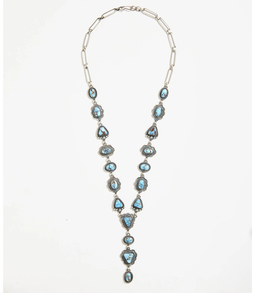 This stunning lariat necklace was hand-crafted with rare turquoise stones that were gathered from the Altyn-Tyube mine in Kazakhstan, also known as the Golden Hill mine.