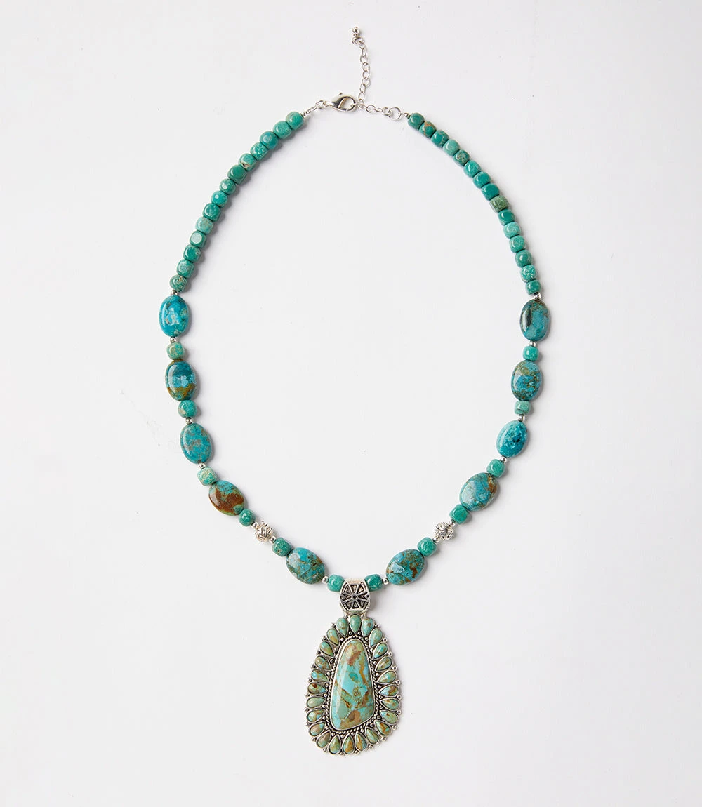 Handcrafted by artisans, this stunning necklace is made of an assortment of earthy-toned turquoise stones. It’s detailed with a turquoise pendant encased in sterling-silver.