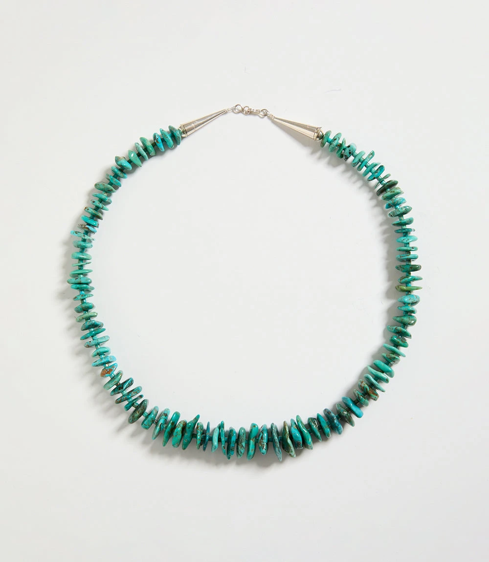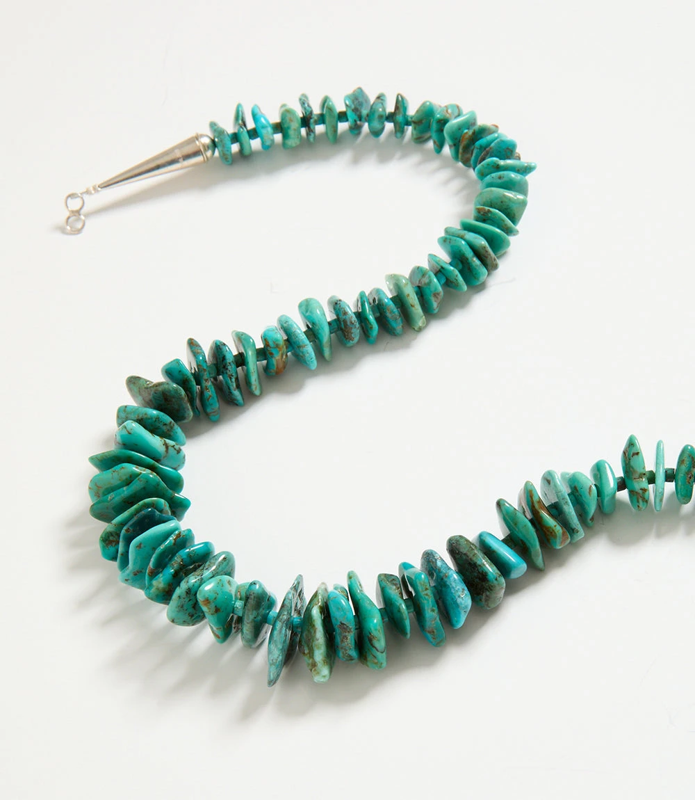 Handcrafted by Native American artisans, this stunning necklace is made of a single strand of turquoise stones and is finished with a sterling silver hook and eye closure.