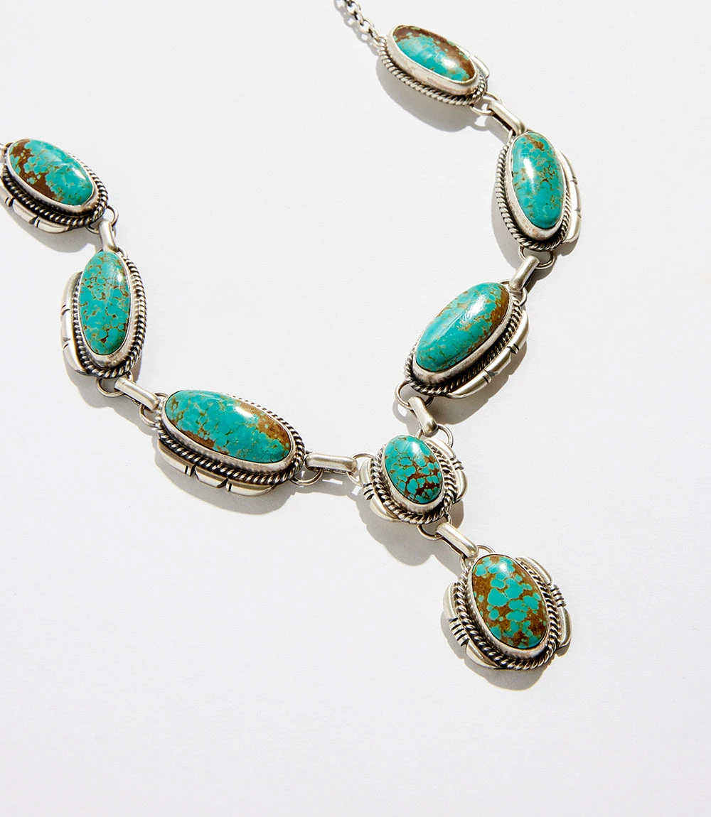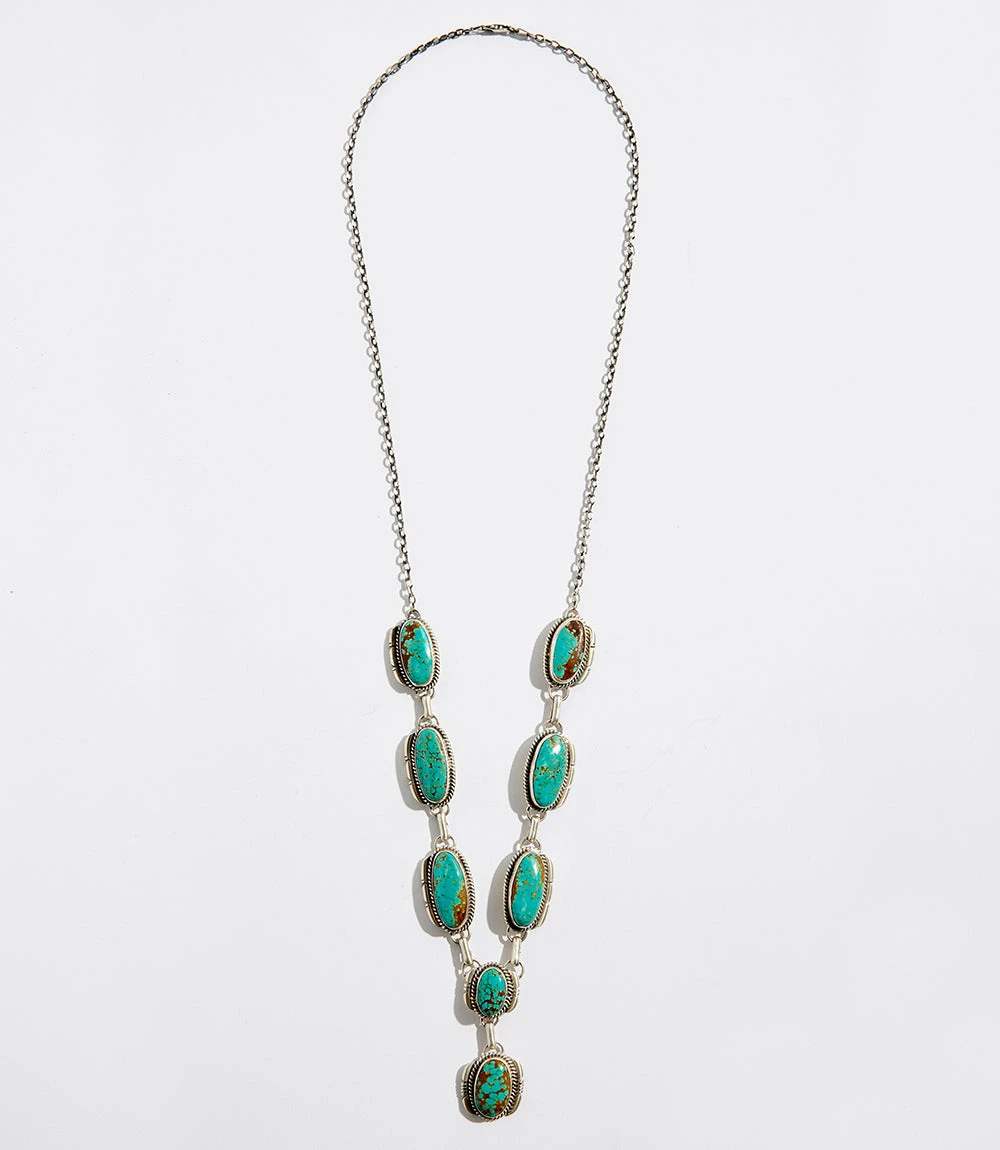 Vibrant turquoise stones outline this sterling silver necklace. Add a Bohemian touch to your look with this unique stone necklace.