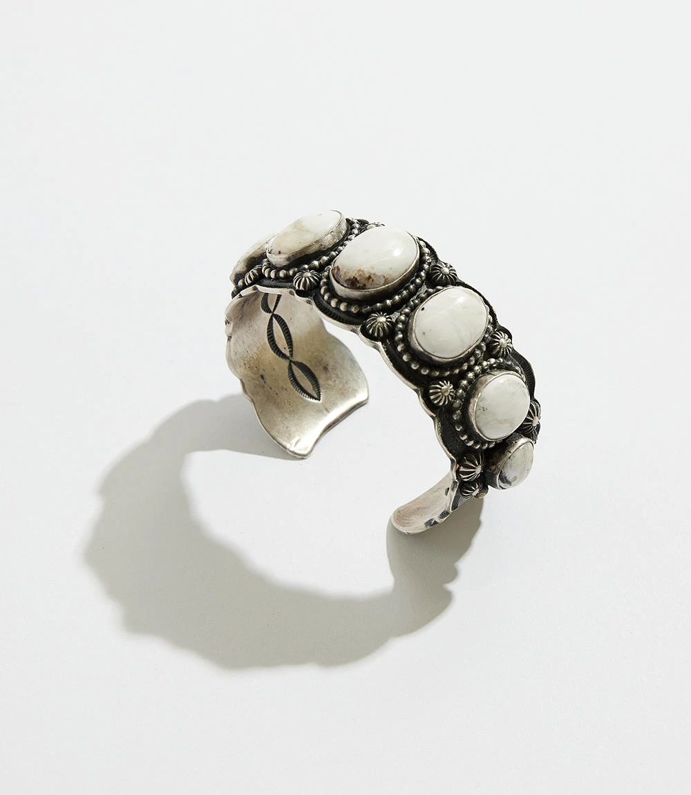 One-of-a-kind White Buffalo stones are encased in a sterling-silver cuff that is detailed with exquisite deep stampwork and silver droplets that decorate the edges.